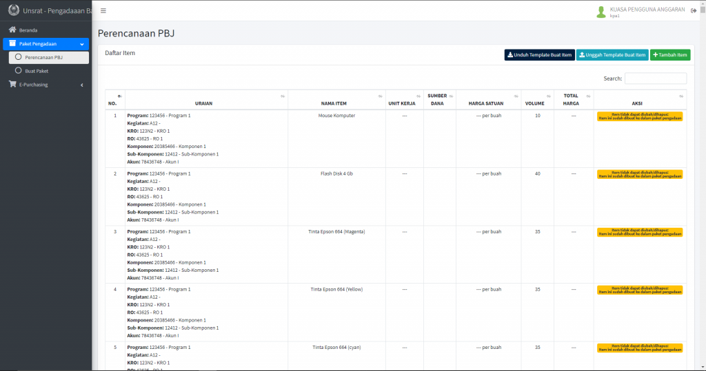 – Klik tombol “Unduh Template Buat Item” untuk mengunduh file template Microsoft Excell untuk mengisi perencanaan