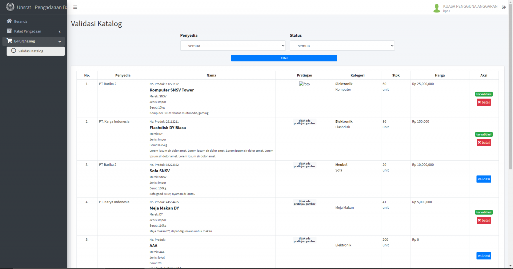 Laman Side Menu E_Purchasing Sub Menu Validasi Katalog